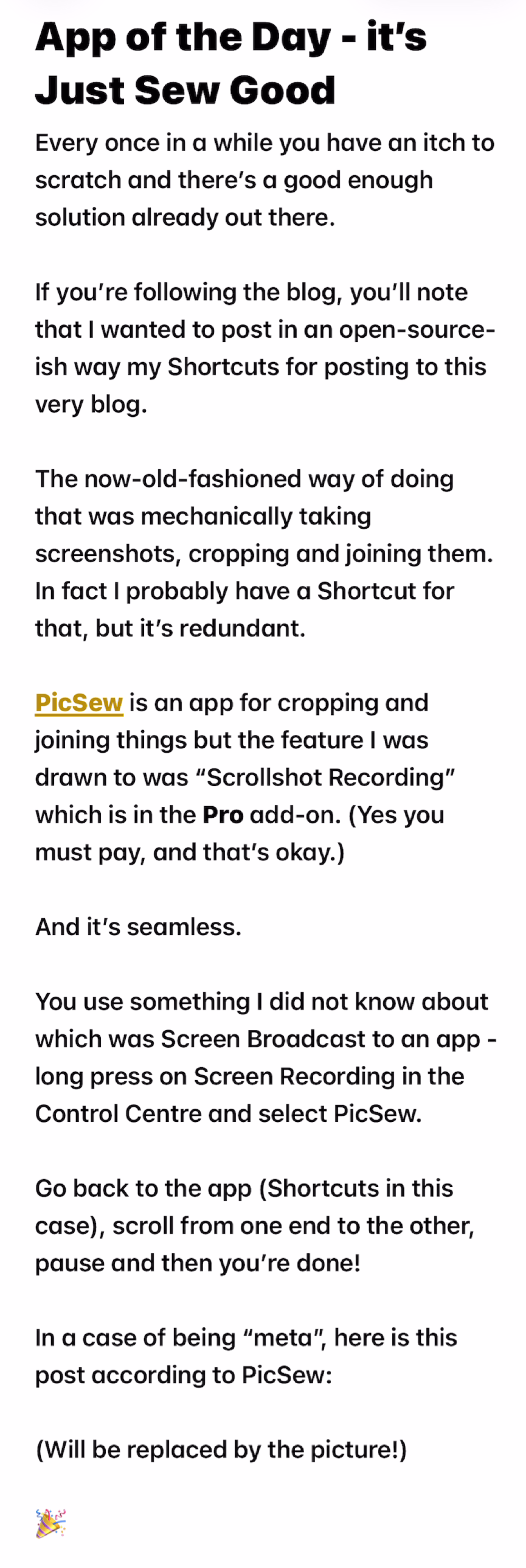 PicSew is an app for cropping and joining things but the feature I was drawn to was “Scrollshot Recording” which is in the Pro add-on. (Yes you must pay, and that’s okay.)